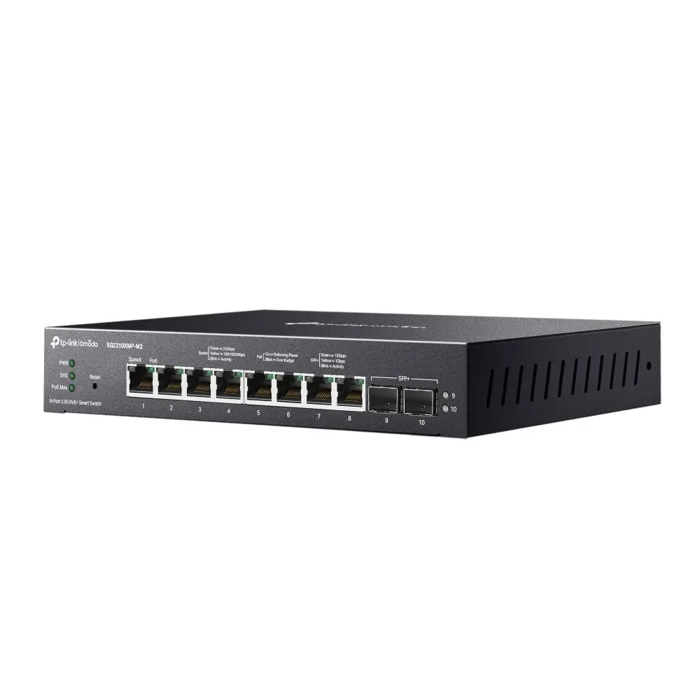 What This Product DoesSG2210XMP-M2 is a 2.5G multi-gigabit switch with eight 2.5G PoE+ ports and two 10G uplink ports, ideal for connecting multi-gigabit WiFi 7/6 access points. Up to 160 W PoE budget, fanless design with compact and durable metal casing, and desktop/wall-mounting design make it suited for different environments. High-performance static routing, advanced security features, a selection of Layer 2 management options, and integration into the Omada SDN (Software-Defined Networking) meet the demand of reliable business networking.2.5G PoE+ Ports and 10G UplinkEight IEEE 802.3at/af-compliant PoE ports supply up to 160 W total power to 802.3at and 802.3af devices.* Set up wireless access points, surveillance cameras, IP phones, and other PoE devices quickly and easily without the hassle and cost of installing power cabling. Two 10 Gbps SFP+ slots deliver non-blocking performance and minimal latency, ensuring rapid, dependable connections to servers and other switches.Secure NetworkingSecurity features include IP-MAC-Port Binding and VLAN Binding, Port Security, Storm Control, and DHCP Snooping to defend against a range of network threats. An integrated list of common DoS attacks is available, making it easier than ever to prevent them.In addition, the Access Control Lists (ACL) feature restricts access to sensitive network resources by denying packets based on source and destination MAC addresses, IP addresses, TCP/UDP ports, or VLAN IDs. Users' network access can be controlled via 802.1X authentication, which works with a RADIUS/TACACS+ server to grant access only when valid user credentials are provided.Advanced QoSLeveraging IP, MAC, TCP, and UDP identifiers, our QoS feature ensures seamless voice and video transmission—even when bandwidth is in short supply.Abundant L2 and L2+ FeatureSG2210XMP-M2 supports a complete lineup of L2 features, including Static Routing, DHCP Server, DHCP Relay, 802.1Q VLAN, Port Mirroring, STP/RSTP/MSTP, Link Aggregation Control Protocol, and 802.3x Flow Control. Advanced IGMP Snooping ensures the switch intelligently forwards multicast streams to only the appropriate subscribers, cutting out unnecessary traffic, while IGMP throttling and filtering restrict each subscriber on a port level to prevent unauthorized multicast access. Static Routing, an L2+ feature, is a simple way of segmenting the network and internally routing traffic through the switch for improved efficiency.Omada SDN IntegrationIntegration into the Omada SDN system brings centralized cloud management and a series of management features, such as Zero-Touch Provisioning (ZTP)** and Abnormal Event Warnings. Omada's Software Defined Networking (SDN) platform integrates network devices, including access points, switches, and routers, providing 100% centralized cloud management. Apart from the ability to be centrally managed via Omada SDN controllers, SG2210XMP-M2 simplifies management via an intuitive web-based Graphical User Interface (GUI) or an industry-standard Command Line Interface (CLI). For both management methods, traffic is protected through SSL or SSH encryption. SNMP (v1/v2c/v3) and RMON support enable the switch to be polled for valuable status information and to send traps for abnormal events.