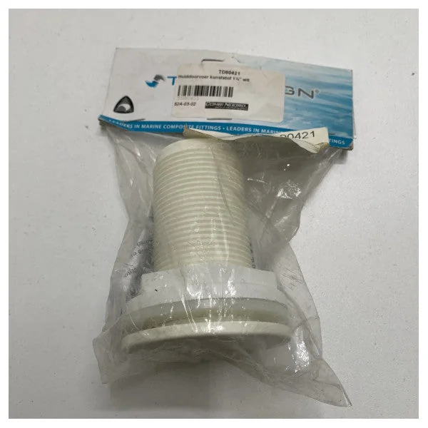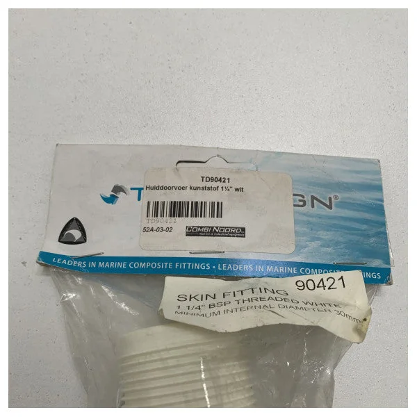 Trudesign 1 1/4 inch plastic skin fitting white - 90421 Product description: The Trudesign 1 1/4 inch plastic skin fitting white - 90421 is a high-quality fitting that is perfect for routing cables and hoses through walls, bulkheads, and decks. The fitting is made from UV-resistant plastic and is designed for long-term outdoor use. Features: Material: UV-resistant plastic Colour: white Diameter: 1 1/4 inch (32 mm) Suitable for cables and hoses with a diameter of up to 28 mm Easy installation Waterproof UV-resistant Chemical resistant Specifications: Dimensions: 44 x 44 x 25 mm Weight: 25 grams Drill hole diameter: 32 mm