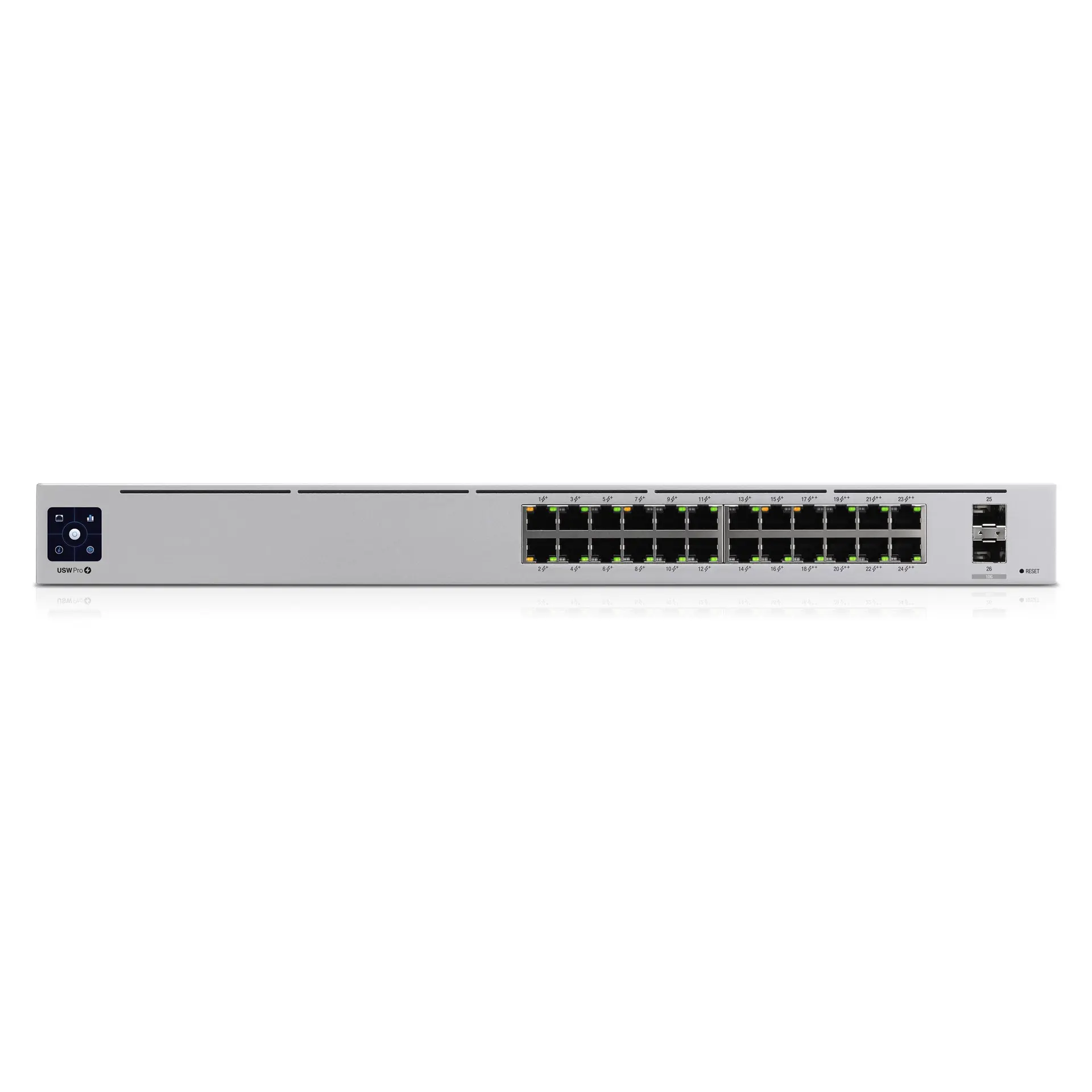 The Ubiquiti UniFi Pro 24-Port PoE Managed Switch features silent cooling and a touchscreen for easy monitoring.