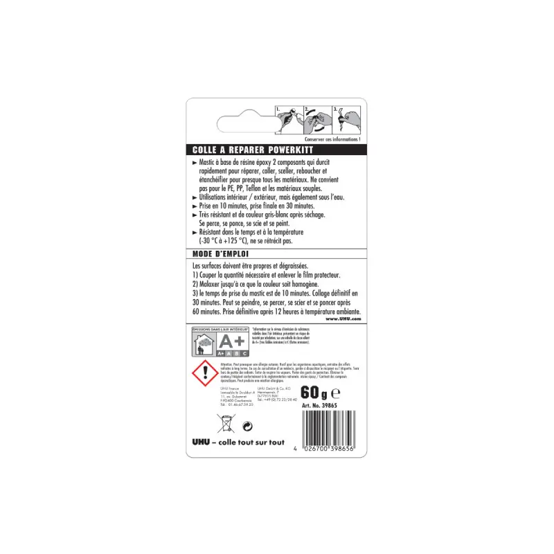 The UHU 39865 repair putty is a multi-purpose two-component epoxy putty that allows for repairs and restorations of all kinds, both indoors and outdoors. Very easy to handle, the repair adhesive can take the desired shape and fill cracks and holes in stone, steel, wood, and other synthetic materials. It solidifies quickly and can be sanded, drilled, and painted.