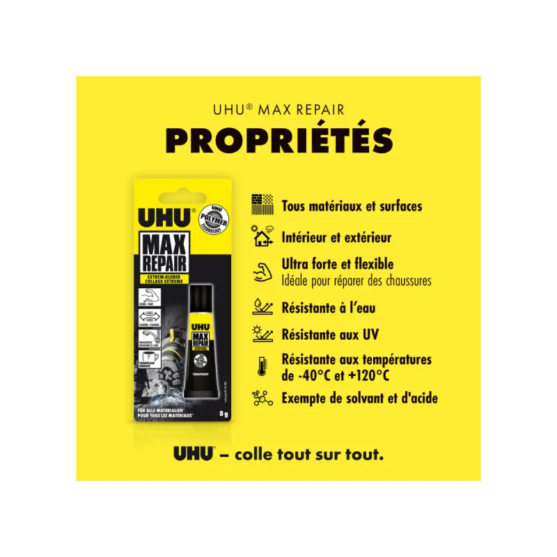 The UHU Max Repair Power Adhesive - 8g - 45865 is a multi-purpose adhesive for all materials and surfaces. With its simple application, you can repair or fill anything you want, even non-static objects like your shoes. No need to visit the cobbler or part with your shoes with loose soles; with UHU's Max Repair Power, just a few drops are enough to securely fix your shoe.