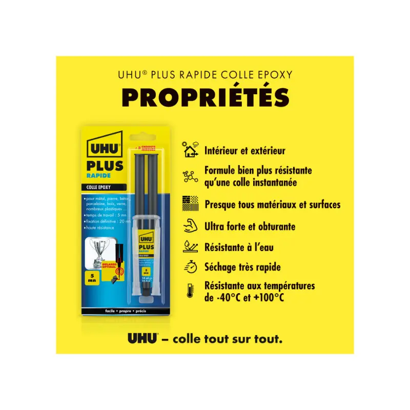 A double compositionfor this UHU Epoxy Rapid 39935 that adapts to most surfaces such as stone, metal, leather, wood, ceramics, and many plastics. Equipped with a double syringe, you achieve an optimal mix to spread on the surface to be glued after 5 minutes. Extra-strong, the glue has resistance to water, temperature, and chemicals.