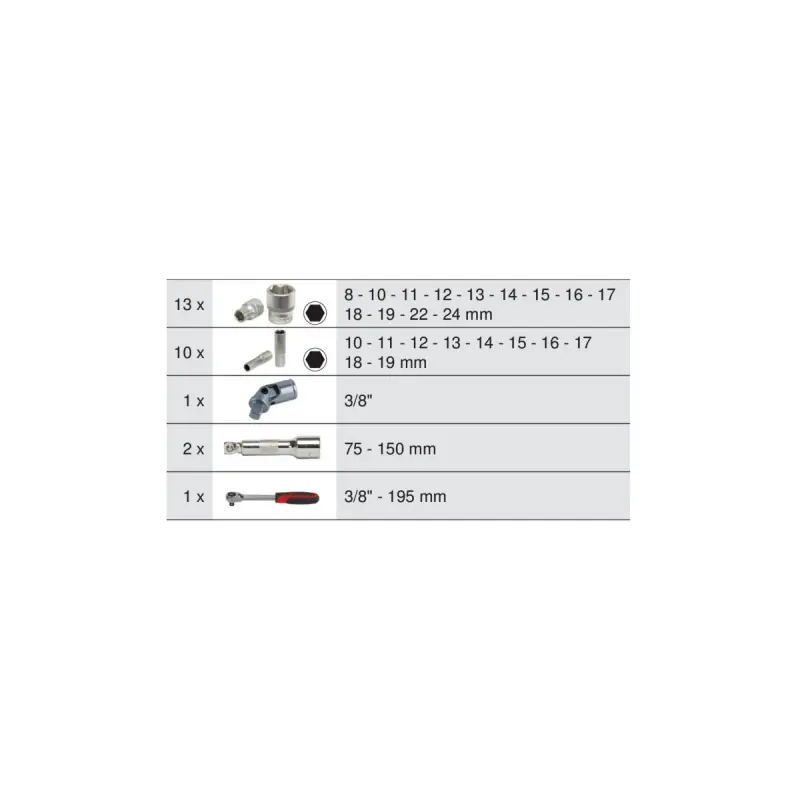 Each piece in this set has been carefully chosen to ensure optimal performance. The sockets are made from high-quality steel, offering increased wear resistance and remarkable longevity. The 3/8'' fastening system ensures compatibility with a wide range of ratchet wrenches, making it easy to use for all your tasks. Whether you are repairing your vehicle, assembling furniture, or carrying out plumbing work, this set will meet all your expectations.