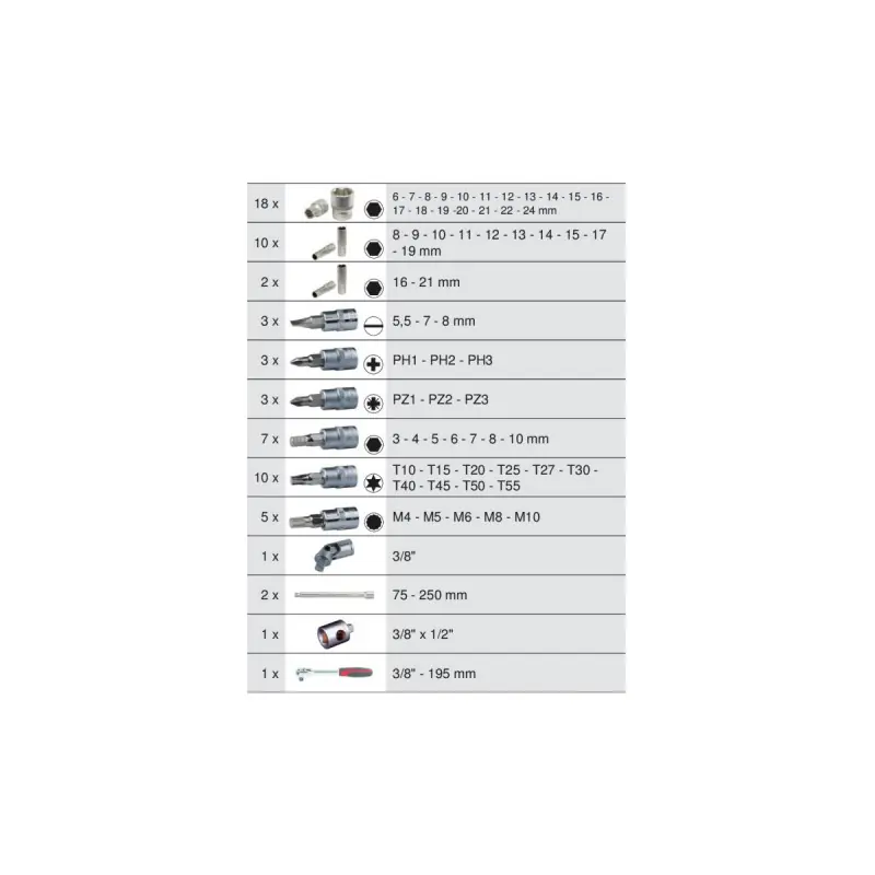 The quality of the materials used in the manufacture of this set ensures long-term durability, allowing you to use it intensively without fear of wear. Moreover, each piece is carefully stored in a practical transport case, facilitating the storage and transport of your tools. No more endless searches to find the right socket; everything is organised to provide you with quick and easy access.
