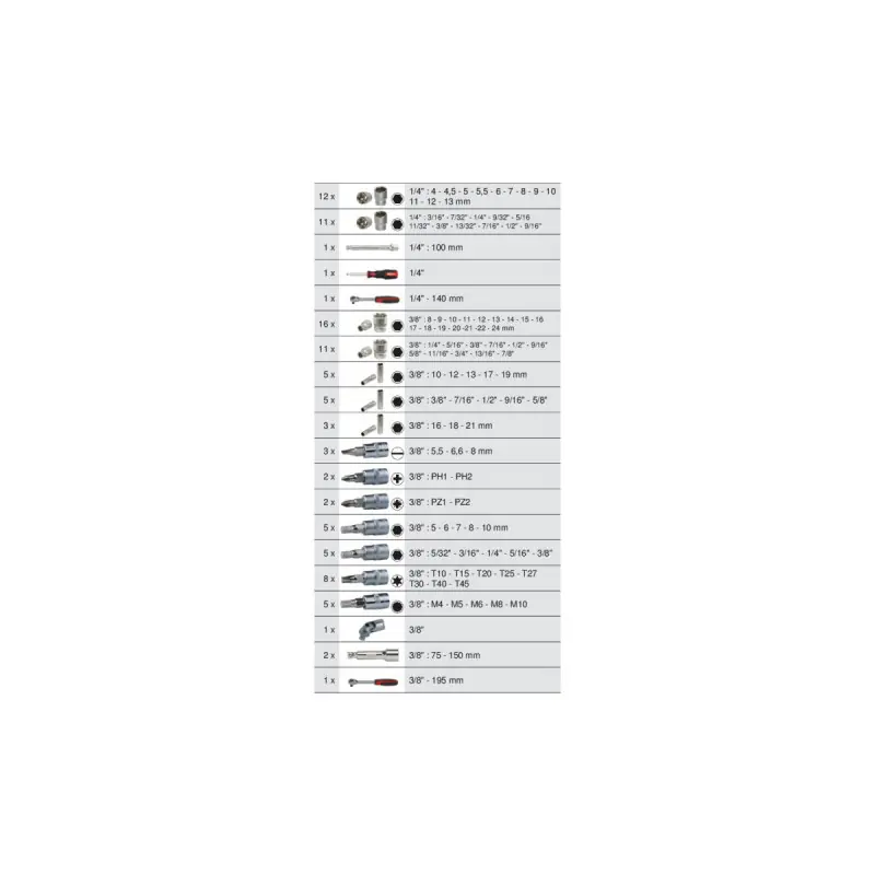 This set is ideal for users who want to optimise their time and efficiency. Each socket is carefully designed to ensure a perfect fit on bolts and nuts, thereby reducing the risk of slipping and damage. Moreover, the chrome vanadium finish ensures exceptional durability, resisting wear and corrosion, which prolongs the life of your tools.