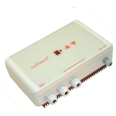 The United Automation Infresco 4kW remote power regulator. The INFRESCO controller has been designed to offer a complete control solution to your outdoor heating area with people comfort and energy saving being the focal points. It has been designed specifically to work with infrared heaters (e.g. garden heating and lighting), or any application where high in-rush current is an issue.Soft-Start – up to 30% extended lamp life Variable Control – allows the user to find the perfect comfort level Temperature monitoring