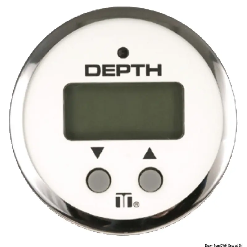 Accurate depth gauge with LCD display, alarms, and 200-kHz transducer.