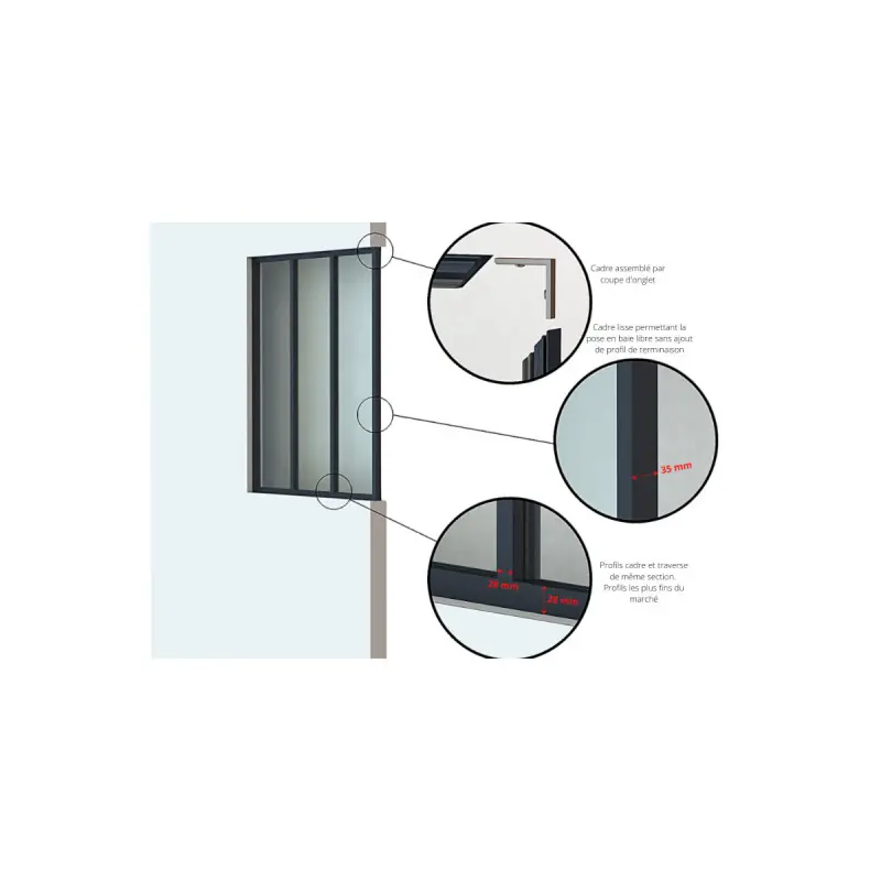 The indoor aluminium glass partition - 2 panes - White - 71 x 123 cm is the perfect element to partition your spaces while maintaining natural light. Its elegant design and harmonious proportions make it a true aesthetic asset for your interior. Thanks to its ultra-slim aluminium profiles of only 28 mm in face view, it offers a modern and clean look that easily integrates into all styles of decoration. This glass partition is easy to assemble and install, adapting to all types of supports. It comes with its panes and wall fixings for simplified installation. Its installation adapts to your project: it can be installed as a partition edge without adding a profile or at an angle with the addition of the corner post profile (sold separately). The aluminium frame covered in an elegant white (RAL 9016 FT) provides great resistance while enhancing its design. This glass partition is also repairable and movable, offering valuable flexibility in case of changes to your interior layout. Manufactured and designed in France, it guarantees impeccable quality and optimal durability.