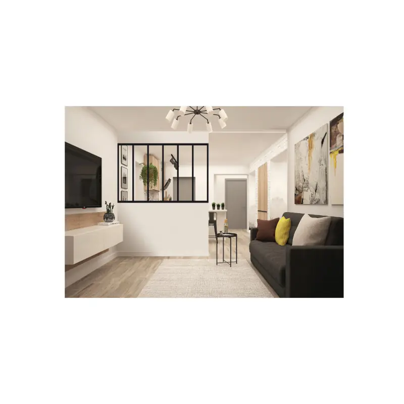 Theindoor aluminium partition - 6 panes - Sanded black - 207 x 123 cm is a decorative element that will enhance your living space. In a kitchen or another room, this French-made partition will add character to your interior while allowing light to enter and creating a separation. It thus combines utility with aesthetics. The aluminium frame is covered in an elegant sanded matte black (RAL 9005 FT) and features a retaining wedge system that allows for very easy glass replacement. This is a significant advantage over other partitions available on the market. Therefore, if you wish to replace a pane, it is not necessary to change the entirety of the glazed section. The assembly is also very simple thanks to a mechanical assembly using brackets and screws.
