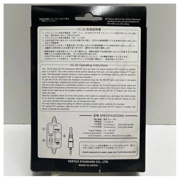 Vertex VC24 VOX | PTT headset with microphone - A08310002 Product description: The Vertex VC24 VOX is a robust PTT headset with a microphone, designed for professional users in demanding environments. The headset is compatible with Vertex radios and offers clear audio and reliable performance. Features: PTT button: With the PTT button on the headset, you can easily communicate with your team members. Vox function: The Vox function ensures that the headset automatically switches on when you start talking, allowing you to keep your hands free. Noise cancellation: The headset has noise cancellation to eliminate background sounds and ensure clear audio quality. Adjustable headband: The headband is adjustable for a comfortable fit. Durable construction: The headset is made from durable materials to last in demanding environments. Specifications: Impedance: 32 ohm Frequency range: 200 Hz - 6 kHz Sensitivity: -42 dB ± 3 dB Microphone type: Electret condenser microphone Cable length: 2.5 m Weight: 150 g