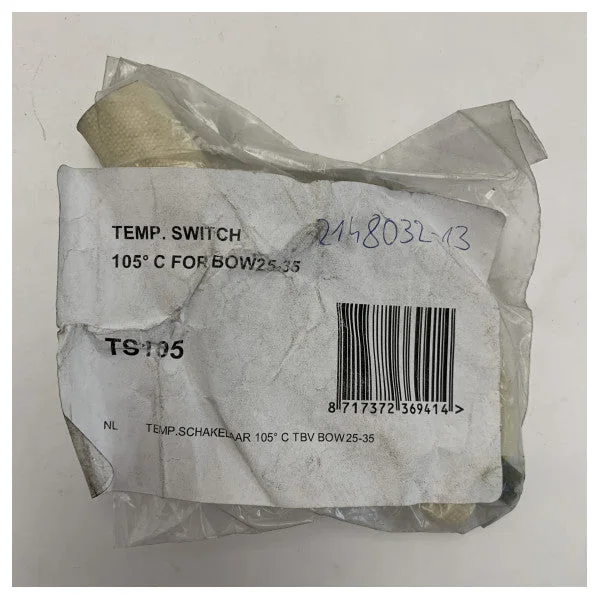 Vetus TS105 - Temperature Switch 105°C for BOW25-35, a reliable temperature switch for boat control systems. Features & Specifications: - Designed for use in combination with the Vetus BOW25-35 bow thruster - Automatically switches off at a temperature of 105°C - Suitable for both 12V and 24V DC systems - Easy to install and operate - Made from high-quality materials for durability and reliability - Compact size for easy mounting - Includes clear instructions for installation and use - Waterproof housing for protection against moisture and dirt - Suitable for use in saltwater and freshwater - Certified to the highest quality standards. Why choose this product? The Vetus TS105 is the ideal temperature switch for your bow thruster. Whether you are a professional skipper or a hobbyist, this product offers reliable performance for your boat control. With the automatic shut-off feature at 105°C, you are assured of safety and protection for your engine. The compact design and easy installation also make the product very suitable for DIY projects. Moreover, the TS105 is made from high-quality materials and meets the strictest quality standards, allowing you to rely on years of trouble-free use. Choose the Vetus TS105 and enjoy worry-free sailing with your bow thruster.