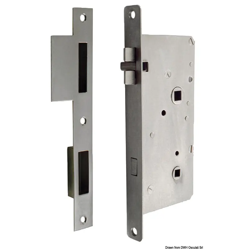 Vibration dampening lock, flush mount, fitted with internal locking system, designed for toilets. External safety locking
