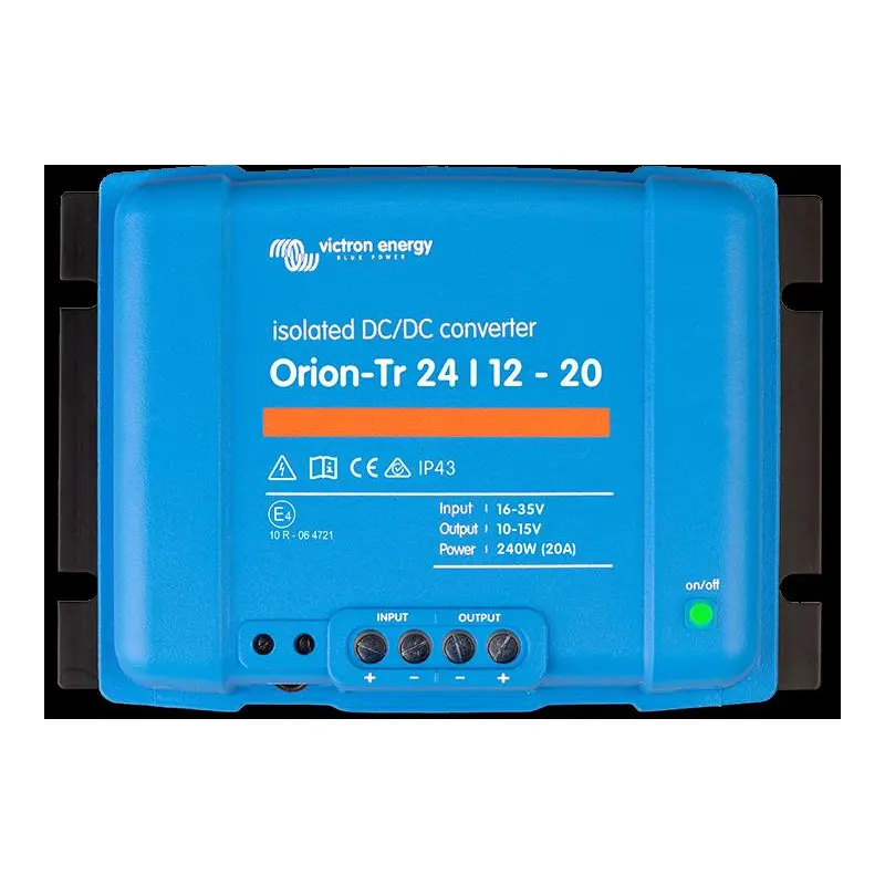 Efficiently converts 24V to 12V power with the Victron Orion Dc-Dc Converter.