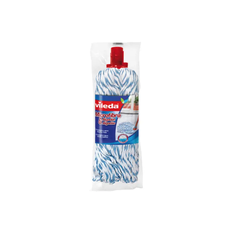 This VILEDA microfibre and cotton mop fits all handles, whether from Vileda or others. Its composition blends microfibres with white strings and cotton with blue strings. The combination of the two ensures high-quality cleaning, and your floor dries quickly thanks to optimised absorption. The nozzle provides fluidity to reach corners where dirt can hide.