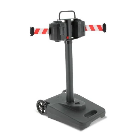 Durable retractable barrier with 20m red/white tape for effective crowd control.