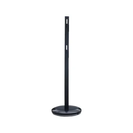 Durable black steel barrier post ideal for crowd control and safety.