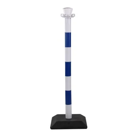 Durable blue and white plastic barrier post designed for effective safety and crowd control.