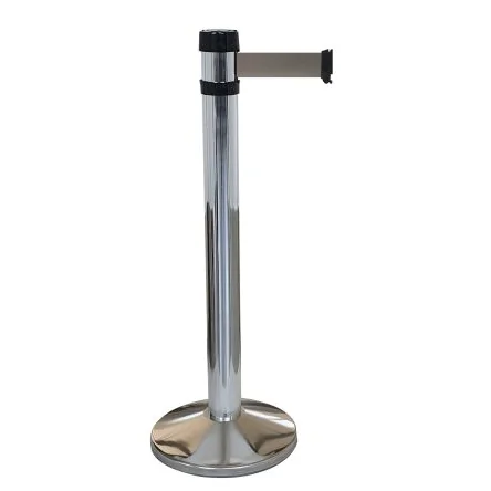 Durable grey aluminium barrier post with tape for effective safety management.