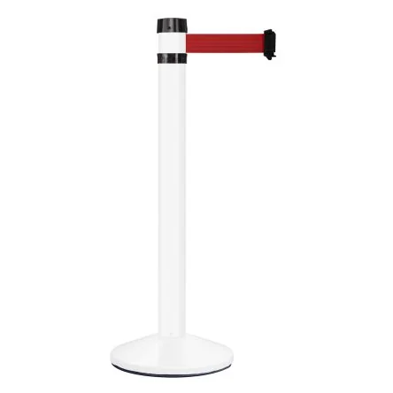 Ensure safety with the Viso White Aluminium Barrier Post featuring red tape for effective crowd control.