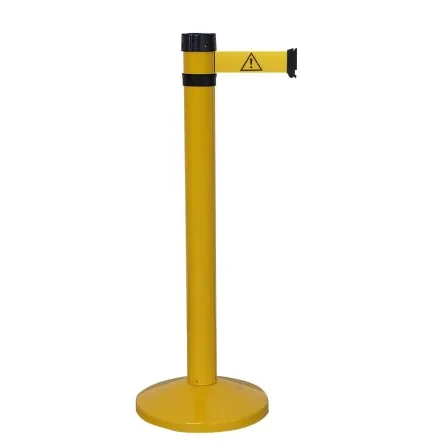 Durable yellow aluminium barrier post with tape for effective crowd control and safety.