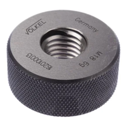 Volkel Go Ring GaugeThe Volkel No-Go ring gauge M18x2.5 is calibrated at a measurement laboratory using IAC thread scanners. It is possible to manually screw into the entire thread of the part without using excessive force. The reference temperature for parts and gauge is 20°C. It is made from high-quality raw material. This gauge is mostly used as an inspection tool.Features and Benefits• Metric measurement system • 6g tolerance • High durability and reliability • Compact size and rugged • Easy to use • AccurateCertifications• ISO1502 • DIN13Certifications• ISO1502 • DIN13