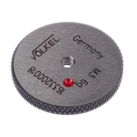 Volkel No-Go Ring GaugeThe Volkel No-Go ring gauge M3x0.5 is calibrated at a measurement laboratory using IAC thread scanners. This NO-GO thread gauge is marked in red. It must not screw into the part by hand by more than two threads. The reference temperature for parts and gauge is 20°C. It is made from high-quality raw material. This gauge is mostly used as an inspection tool.Features and Benefits• Metric measurement system • 6g tolerance • High durability and reliability • Compact size and rugged • Easy to use • AccurateCertifications• ISO1502 • DIN13Certifications• ISO1502 • DIN13