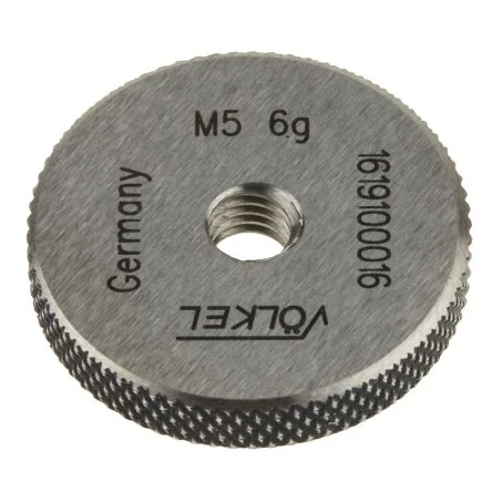 Volkel Go Ring GaugeThe Volkel Go ring gauge M5x0.8 is calibrated at measurement laboratory using IAC thread scanners. This thread NO-GO ring gauge must not screw into the part by hand by more than two threads. The reference temperature for parts and gauge is 20°C. It is made from high-quality raw material. This gauge is mostly used as an inspection tool.Features and Benefits• Metric measurement system • 6g tolerance • High durability and reliability • Compact size and rugged • Easy to use • AccurateCertifications• ISO1502 • DIN13Certifications• ISO1502 • DIN13