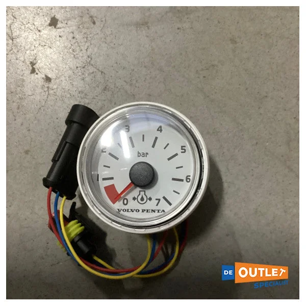 The Volvo Penta pressure gauge 7-bar white - 874923 is a high-quality pressure gauge specifically designed for use in marine environments. The gauge features a white background with clear black numbers and markings, making it easy to read even in bright sunlight. The gauge has a range of 0 to 7 bar and is capable of accurately measuring the pressure of various liquids and gases, including fuel, oil, water, and air. The housing of the gauge is made from durable material that is resistant to corrosion and UV radiation. The Volvo Penta pressure gauge 7-bar white - 874923 is compatible with most Volvo Penta engines and can be connected to the engine's pressure sensor via a standard 1/8" NPT fitting. The gauge has a diameter of 52 mm and is equipped with a rubber seal to ensure waterproofing. Overall, the Volvo Penta pressure gauge 7-bar white - 874923 is a reliable and accurate pressure gauge suitable for a wide range of applications in the marine sector.