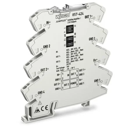 The WAGO 857 Series Signal Conditioner efficiently processes current and voltage signals with a 24V DC supply.