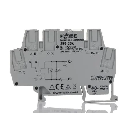 Wago Rail Terminal BlockThe Wago rail-mounted terminal block with miniature switching relay has a single changeover contact. It is actuated with a 24VDC coil and 10mA switching current. Inclusions: Relay sockets Jumper bars Marker stripsFeatures and BenefitsOperating temperature ranges between -25°C and 60°C Terminal type is plug-in Contact material is AgSnO2CertificationsEN 60664-1 GL UL 508