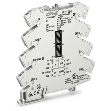 857 Series Isolation Amplifiers. Wago 857 series JUMPFLEX configurable isolation amplifiers convert, amplify, filter and electrically isolate standard analogue signals. Features and Benefits. Clipping capability provides analogue signal limitation to output end values. Calibrated scale switching. PC configuration interface. Safe 3 way isolation with 4 kV test voltage per EN 61140