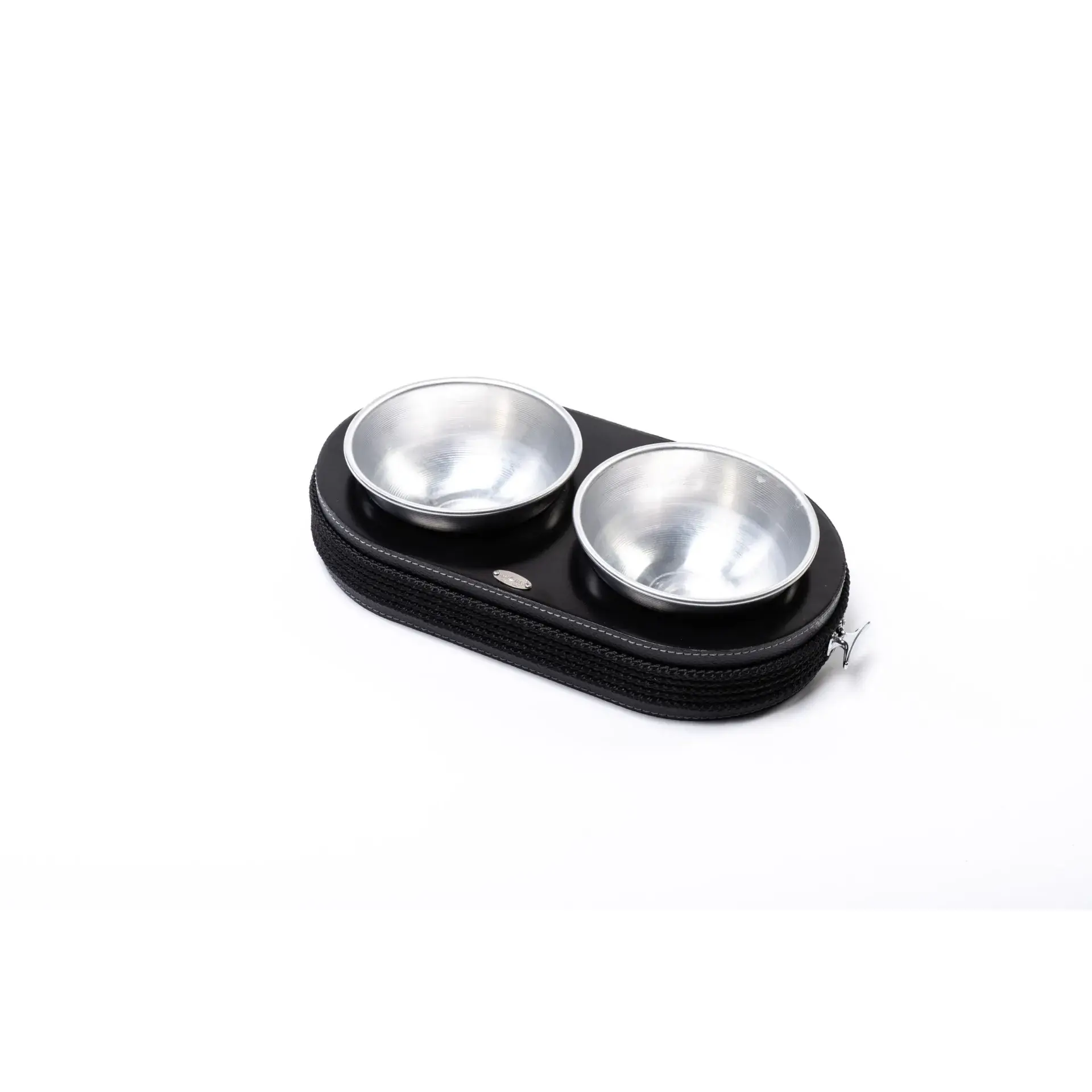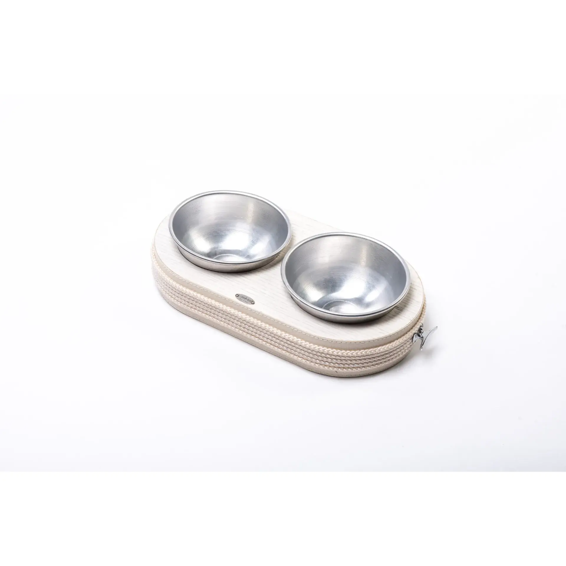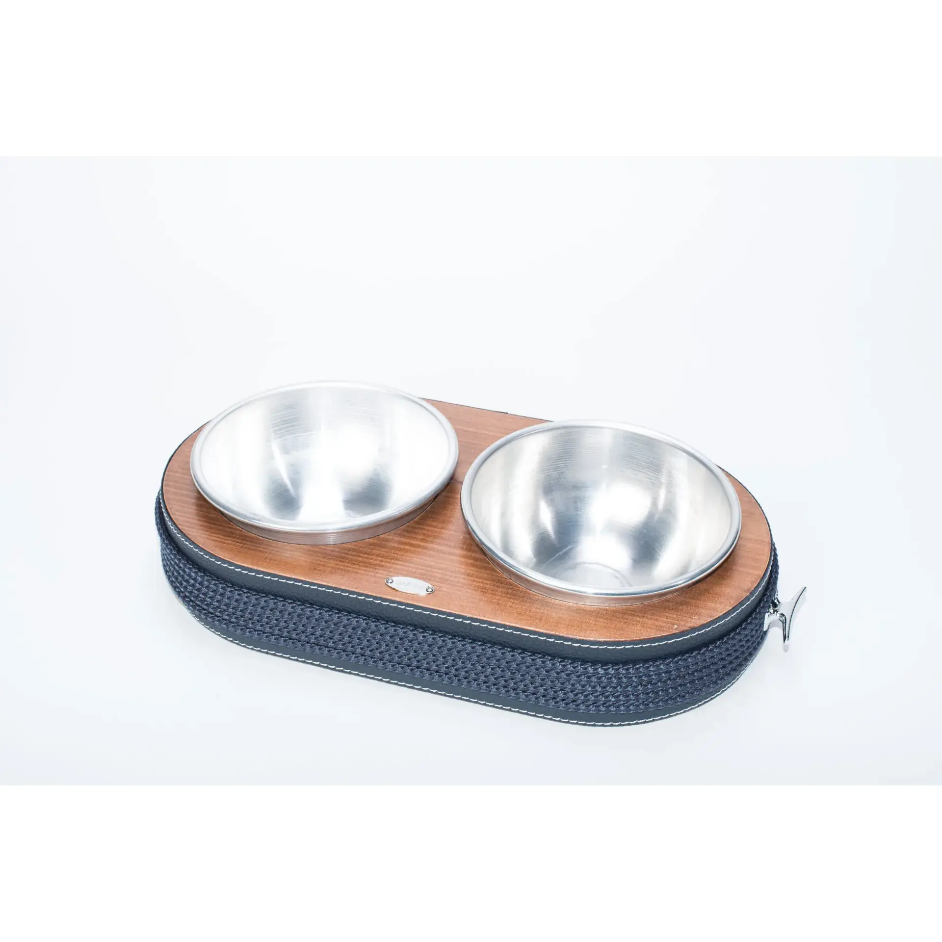 Stylish pet water and food bowls featuring a wooden base and two stainless steel bowls for durability.