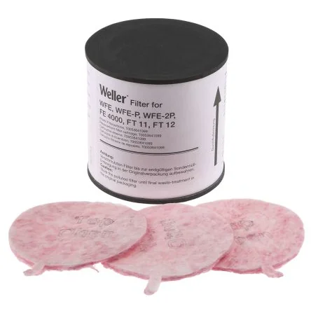 Weller FT Filter System - Solder Fume Extraction Filters. Introducing a series of solder fume extraction filters from Weller. These filters are designed to be used with the appropriate Weller filter system to capture particles and harmful vapour emitted from soldering. The unique attribute of these Weller filters is the increased filtration time of the fumes within the filters, this process ensures 100% removal of hazardous substances. How do they work?. There are 3 levels of filtration, large particles are captures by the fleece in the fine dust filter pre-filtering, harmful vapour is locked in by the particle filter then the remaining gas particles are separated by the wide band filter. How easy are they to fit?. These compact filters can be easily replaced, simply remove the pressure hose, remove the old filter, place the new one in and attach the pressure hose. This process is the same for all Weller FT systems. Features and Benefits. ;ul> ;li>Compact filters ;/li> ;li>3 levels of filtration ;/li> ;li>100% removal of hazardous substances ;/li> ;li>Easy to replace ;/li> ;/ul>. Options. ;ul> ;li>T0058762701; For use with Zero Smog EL, Zero Smog 2, WFE 2ES, WFE 2CS = RS stock no: ; 391-359. 391-359. ;/li> ;li>T0058762858; For use with Zero Smog TL = RS stock no: ; 124-0176. 124-0176. ;/li> ;li>T0053641099; For use with WFE, WFE P, WFE 2P, FT 11, FT12, FE 4000 = RS stock no: ; 405-3452. 405-3452. ;/li> ;li>T0058735936N; For use with WFE 2S, Zero Smog 4V = RS stock no: ; 758-1486. 758-1486. ;/li> ;li>T0058735895N, For use with WFE 2S, Zero Smog 4V, WFE 2ES = RS stock no: ; 878-1013. 878-1013. ;/li> ;/ul>. Typical Applications. Weller solder fume extraction filters are used in Weller FT systems, designed to filter harmful solder fumes and provide breathable air at work stations. They are found in applications such as; Electronic ; Electrical Servicing Soldering ; Desoldering DIY