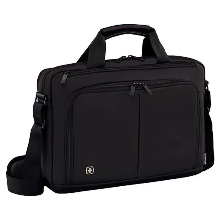 Wenger SOURCE Laptop Briefcase. From Wenger SwissGear, the SOURCE laptop briefcase is compact and versatile, with dual compartments and a quik pocket for easy access to essentials. The front compartment has various useful pockets, with spaces ideal for iPads and tablets, mobile phones, relevant cables and business cards. It also features a file divider for separating documents. With a padded handle and detachable shoulder strap, this briefcase style laptop case is easy to carry, and well suited to a highly mobile lifestyle. Whether it ‘s on a hectic commute, or day packed with meetings and presentations, the SOURCE laptop case is ideal. Features and Benefits. Padded laptop compartment Tablet / eReader pocket with anti-scratch lining File divider separates documents Rear pocket unzips to become a pass-through trolley sleeve Removable shoulder straps Quik Pocket for easy access to essentials Rear pocket unzips to become a Pass-Through trolley sleeve for easy travel wheeled luggage Material: Nylon 400d with PVC backing and Polyester lininglining