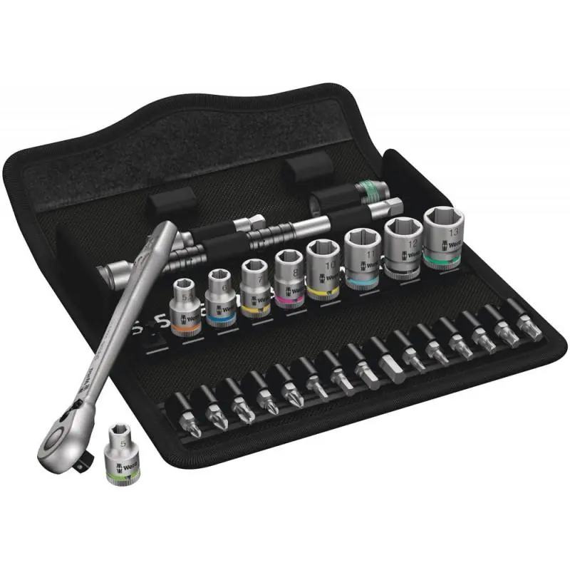 The Wera 1/4" Metric 28-Piece Ratchet Set is designed for precision and durability in confined spaces. This comprehensive set includes a 1/4" drive Zyklop ratchet with a switch lever, a 150mm extension, a 56mm wobble extension, a 1/4" bit adaptor, nine metric sockets (5mm to 13mm), and various bits, all housed in a robust textile case for easy storage and transport.