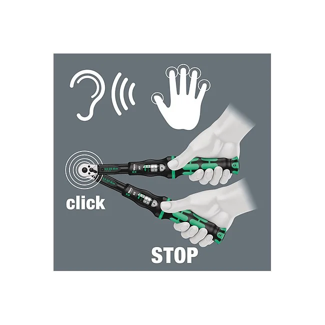 The Wera Click-Torque B 1 is a high-precision torque wrench designed for right-hand (clockwise) use, featuring a 3/8" square drive with a 45-tooth reversible ratchet mechanism. It offers a torque range of 10-50 Nm, with an accuracy of ±3% as per DIN EN ISO 6789-1:2017-07. The ergonomic two-component handle ensures comfortable handling during use. The wrench provides audible and tactile signals upon reaching the set torque value, enhancing user confidence and safety. The overall length of the wrench is 360 mm, and it weighs approximately 1.056 kg.