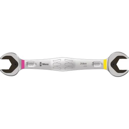 6002 Joker Double open-ended wrenchesHigh-quality, metric double spanner from Wera: Everything a wrench can do and so much more. Faster, better, more beautiful. A real Joker! The new generation of ring ratchet spanners. For hexagon screw heads and bolts. With holding function by a metal plate in the mouth, which reduces the risk of losing screws and sockets. With its extra hard teeth the exchangeable metal plate in the mouth secures screws and sockets and reduces the risk of slipping. The integrated end stop can prevent the screw head from slipping down and allows to apply high torques. The double hexagon geometry ensures a positive connection with the screw or bolt and thus reduces the risk of slipping. A back-pivoting angle of only 30 ° avoids time-consuming rotating of the wrench while screwdriving. The special forge geometry sees to a high torque transmission and high bending stiffness. Made of high-performance chromium molybdenum steel with nickel-chromium coating for high corrosion protection. With Take it easy tool finder: colour coding by size.Practical holding function thanks to the metal plate in the jaw Limit stop prevents any slipping The double-hex geometry reduces the risk of slipping Return angle of only 30° With Take it easy tool finder: colour coding by size6002 Joker Double open-ended wrenches, 20 x 22 x 260.5 mmLimit stop prevents any slipping It has return angle of 30° It prevents slipping off of the fastener head with its integrated limit stopSparking