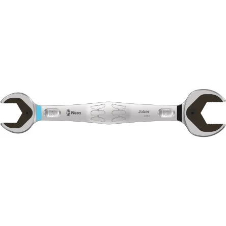 6002 Joker Double open-ended wrenchesHigh-quality, metric double spanner from Wera: Everything a wrench can do and so much more. Faster, better, more beautiful. A real Joker! The new generation of ring ratchet spanners. For hexagon screw heads and bolts. With holding function by a metal plate in the mouth, which reduces the risk of losing screws and sockets. With its extra hard teeth the exchangeable metal plate in the mouth secures screws and sockets and reduces the risk of slipping. The integrated end stop can prevent the screw head from slipping down and allows to apply high torques. The double hexagon geometry ensures a positive connection with the screw or bolt and thus reduces the risk of slipping. A back-pivoting angle of only 30 ° avoids time-consuming rotating of the wrench while screwdriving. The special forge geometry sees to a high torque transmission and high bending stiffness. Made of high-performance chromium molybdenum steel with nickel-chromium coating for high corrosion protection. With Take it easy tool finder: colour coding by size.Practical holding function thanks to the metal plate in the jaw Limit stop prevents any slipping The double-hex geometry reduces the risk of slipping Return angle of only 30° With Take it easy tool finder: colour coding by size6002 Joker Double open-ended wrenches, 24 x 27 x 280 mmLimit stop prevents any slipping It has return angle of 30° It prevents slipping off of the fastener head with its integrated limit stop