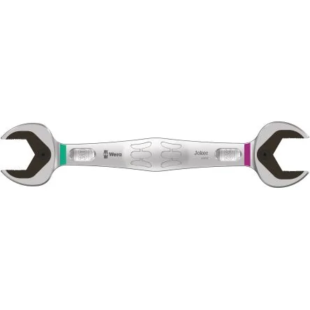 6002 Joker Double open-ended wrenchesHigh-quality, metric double spanner from Wera: Everything a wrench can do and so much more. Faster, better, more beautiful. A real Joker! The new generation of ring ratchet spanners. For hexagon screw heads and bolts. With holding function by a metal plate in the mouth, which reduces the risk of losing screws and sockets. With its extra hard teeth the exchangeable metal plate in the mouth secures screws and sockets and reduces the risk of slipping. The integrated end stop can prevent the screw head from slipping down and allows to apply high torques. The double hexagon geometry ensures a positive connection with the screw or bolt and thus reduces the risk of slipping. A back-pivoting angle of only 30 ° avoids time-consuming rotating of the wrench while screwdriving. The special forge geometry sees to a high torque transmission and high bending stiffness. Made of high-performance chromium molybdenum steel with nickel-chromium coating for high corrosion protection. With Take it easy tool finder: colour coding by size.Practical holding function thanks to the metal plate in the jaw Limit stop prevents any slipping The double-hex geometry reduces the risk of slipping Return angle of only 30° With Take it easy tool finder: colour coding by size6002 Joker Double open-ended wrenches, 30 x 32 x 305 mmLimit stop prevents any slipping It has return angle of 30° It prevents slipping off of the fastener head with its integrated limit stop