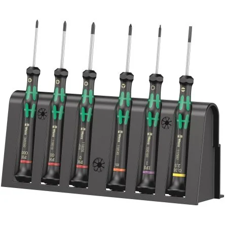 2050/6 Screwdriver set and rack for electronic applicationsHigh quality Wera Micro screwdriver set for precision mechanical work. Rapid twisting is possible by fixing the hand on the twist cap and using the fast-turning zone just below it. This makes time-consuming grip adjustments unnecessary. Power zone with integrated soft zones ensure the transfer of higher tightening and loosening torque. Precision zone for the right angle for adjustment work. The Wera Black Point tip offers high corrosion protection and an exact fit. Includes practical rack for tidy storage of the screwdrivers.Kraftform Micro screwdriver for slotted, Phillips-Recess, IPR and Microstix® screws Multi-component Kraftform Micro handles for fast and ergonomic screwdriving Anti-roll feature and swivel cap for rapid twisting The Wera Black Point tip offers an exact fit and optimum corrosion protection Take it easy tool finder: colour coding according to profile and size1x 2050/6 Screwdriver set and rack for electronic applications, 6 pieces 3x 2050 PH Screwdriver for Phillips screws for electronic applications: PH 000x40, PH 00x40, PH 0x40 1x 2067 IPR TORX PLUS® Screwdriver for electronic applications, 1 IPR x 40 mm 1x 2072 Kraftform Micro screwdriver for Microstix® screws, m x 40 mm 1x 2035 Screwdriver for slotted screws for electronic applications, 0.35 x 2.5 x 40 mmThe fast-turning zone just below the rotating cap allows rapid twisting. The Wera Black Point tip offers an exact fit and optimum corrosion protection Multi-component Kraftform Micro handles for fast and ergonomic screwdriving Includes practical rack for tidy storage of the screwdrivers Indispensable for many users, including electronics technicians, opticians, precision engineers, jewellers, EDP hardware fitters and model-makers.