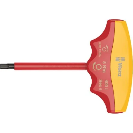 400 i VDE Hex Insulated torque-indicatorWera VDE torque indicator with fixed torque for hexagon socket screws. Tamper proof. The robust slip clutch generates a clearly audible and tactile trigger that signals when the set torque is reached, making it impossible to apply any further torque. The loosening torque value is significantly higher than the set tightening torque, therefore no additional tools are needed for loosening screw connections. The shape of the handle perfectly fills the whole hand and fingers comfortably lie in the softly rounded recessed grips. This ensures optimal, ergonomic power transfer. Individually tested tool as per IEC 60900 at 10,000 V for safe working at the approved voltage of 1,000 V.Insulated, individually tested VDE T-handle torque indicator for safe working up to 1,000V T-handle is ideal for transferring controlled tightening torque and high loosening torque Error-free screwdriving due to non-slip friction clutch and exact torque transmission Distinctly audible and noticeable excess-load signal when the pre-set torque is reached Tamper-proof against accidental changing of set torque value400 i VDE Hex Insulated torque-indicator, 5 x 5.0 NmInsulated, individually tested VDE T-handle torque indicator for safe working up to 1,000V T-handle is ideal for transferring controlled tightening torque and high loosening torque Error-free screw driving due to non-slip friction clutch and exact torque transmission Distinctly audible and noticeable excess-load signal when the pre-set torque is reached Tamper-proof against accidental changing of set torque value
