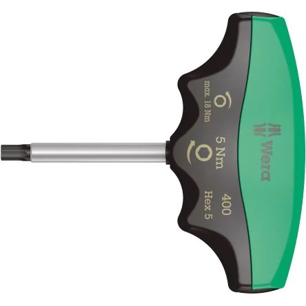 400 Hex Torque-indicatorWera torque indicator with fixed torque for hexagon sockets. Tamper proof. The robust slip clutch guarantees a clearly audible and tactile trigger signal when the set torque value is reached, and it is therefore impossible to apply any further torque. The loosening torque is significantly higher than the set tightening torque, therefore no additional tools are needed for loosening screw connections. The shape of the handle fills the whole hand well and the fingers lie in the softly rounded recessed grips. This ensures optimal, ergonomic power transmission.T-handle is ideal for transferring controlled tightening torque and high loosening torque Error-free screwdriving due to non-slip friction clutch and exact torque transmission Tamper-proof against accidental changing of set torque value Particularly corrosion resistant blade400 Hex Torque-indicator, 5 x 5.0 NmT-handle is ideal for transferring controlled tightening torque and high loosening torque Error-free screw driving due to non-slip friction clutch and exact torque transmission Tamper-proof against accidental changing of set torque value Particularly corrosion resistant blade