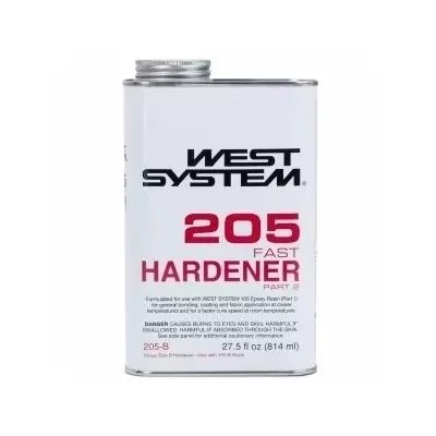 Hardener 205 is used in most situations to produce a fast cure and results in an epoxy that rapidly develops its physical properties. When mixed at a ratio of five parts by weight of Resin 105 to one part by weight of Hardener 205, the cured resin/hardener mixture produces a high strength, rigid solid that possesses excellent cohesive properties and provides an exceptional moisture barrier with excellent bonding and coating properties.