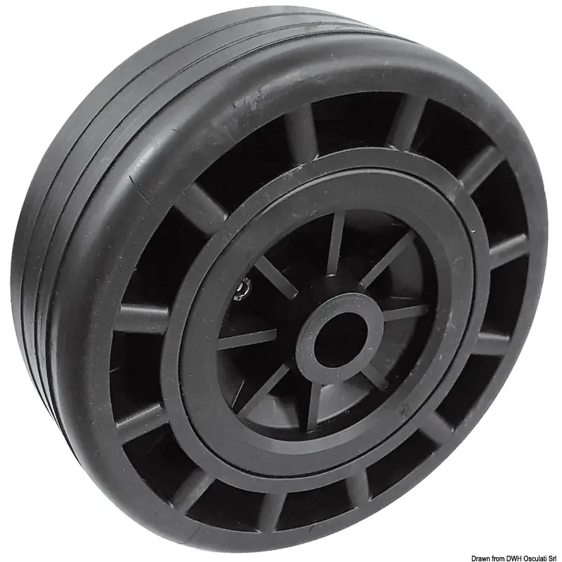 Durable rubber-coated wheel with a technopolymer core, perfect for marine applications.