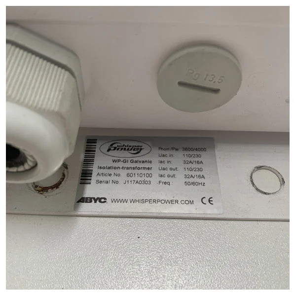 Used Whisper Power WP-GI galvanic isolation transformer 3600VA - 60110100 Product description: This used Whisper Power WP-GI galvanic isolation transformer is a 3600VA unit designed to isolate electrical circuits and protect against earth faults and power disturbances. The transformer is ideal for use in maritime, industrial, and other environments where a reliable power supply is crucial. Features: Galvanic isolation: The transformer provides a physical barrier between the primary and secondary windings, preventing electrical currents from jumping across. This protects equipment from earth faults and power disturbances. High efficiency: The transformer has a high efficiency, meaning that little energy is lost during the conversion of power. Low noise level: The transformer produces a low noise level, making it ideal for use in environments where noise pollution can be an issue. Compact housing: The transformer has a compact housing, making it easy to install. Specifications: Model: Whisper Power WP-GI Power: 3600VA Input voltage: 230V AC Output voltage: 230V AC Frequency: 50/60Hz Insulation class: H Protection class: IP21 Dimensions: 270 x 200 x 140 mm Weight: 10 kg