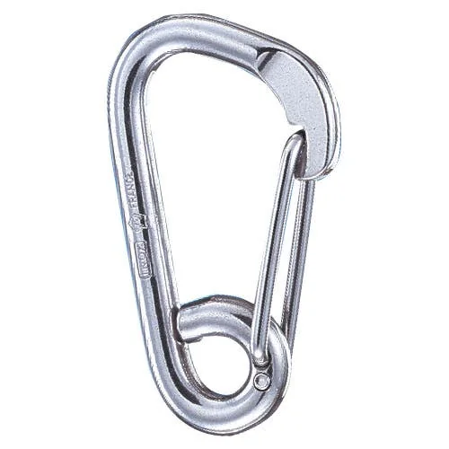 The WICHARD Asymmetric Fireman's Carabiner is a forged stainless steel snap hook designed for rapid maneuvers and harness backups, offering optimal load transfer and safety. Its asymmetrical shape enhances load distribution, making it ideal for quick applications. The integrated eye allows for easy attachment of webbing or straps, adding versatility to its design. Manufactured in France, this carabiner is suitable for various marine environments, including sailboats and catamarans.