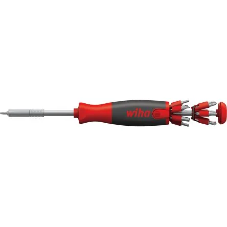 The Wiha Tools 43895 is a Lift Up screwdriver with bit magazine 26one® magazine bit holder has 13 double bits 12 in the magazine and 1 in the bit holder. Inside the bit holder, there is a two-row bit clip in a compartment design, thus enabling easy removal of the bits.Simplifies work 26 tools in one Saves time