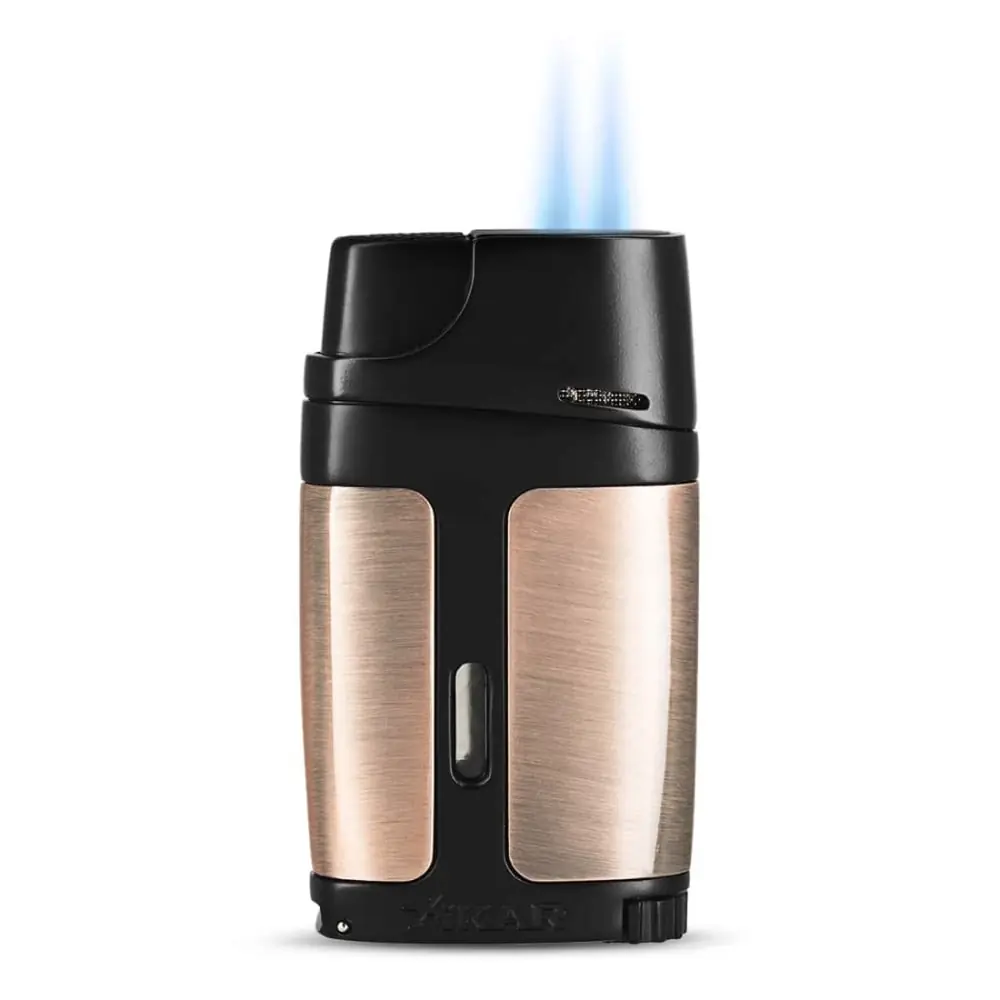 this stylish lighter combines a copper and black finish with advanced technology including a dual torch flame and electronic ignition. refillable with gas it also offers an adjustment wheel for the power of the flames and an integrated punch cigar cutter.