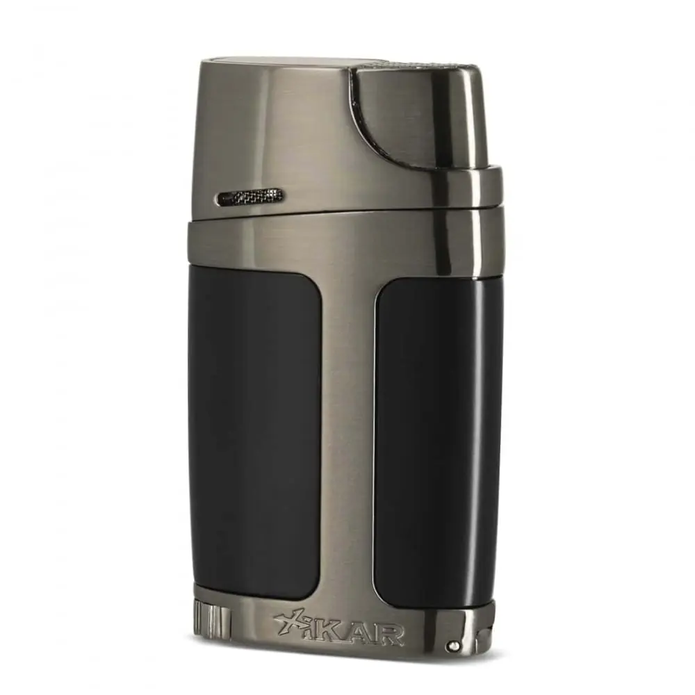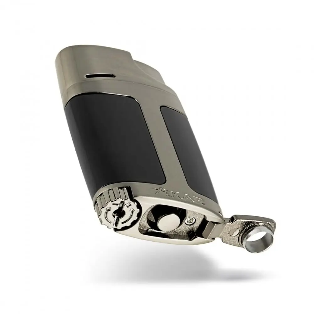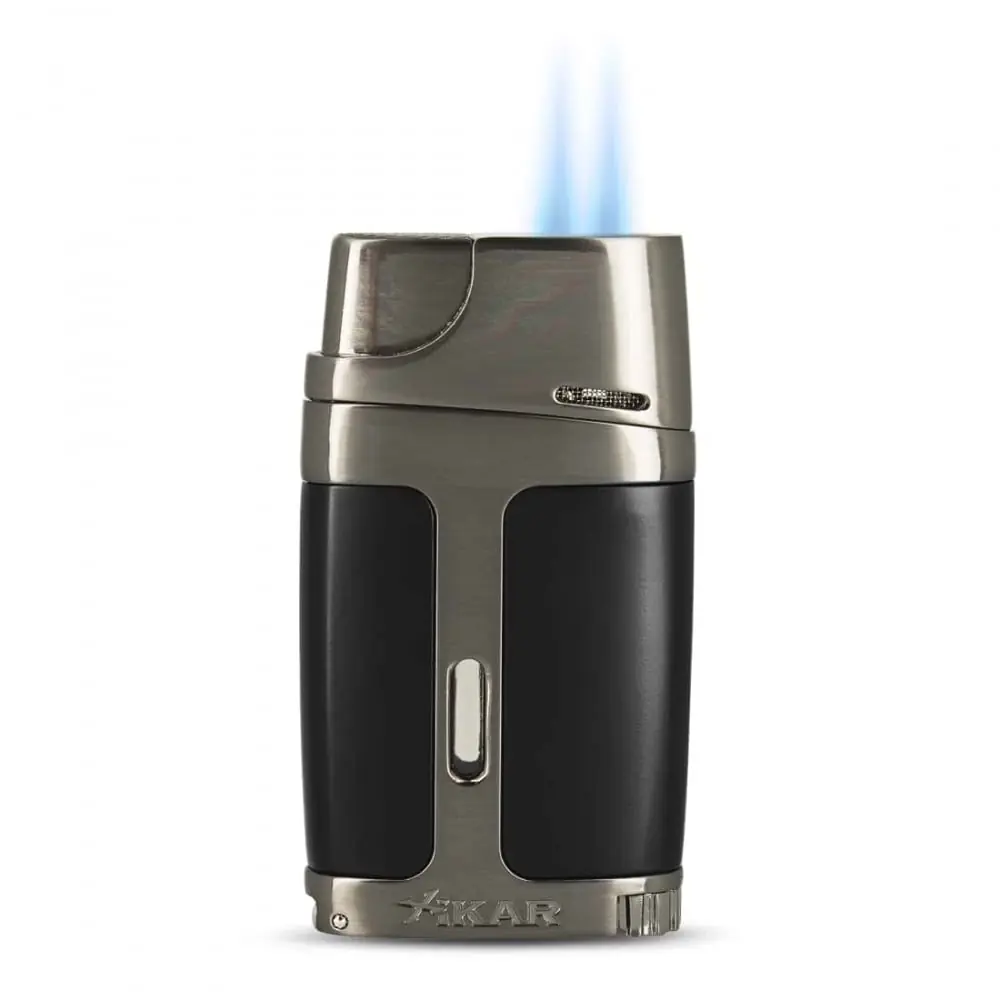 this two-tone black and gun lighter combines advanced technology and modern design. it has a double torch flame electronic ignition and is gas refillable. the adjustment wheel allows you to adjust the power of the flames and it incorporates a punch cigar cutter.
