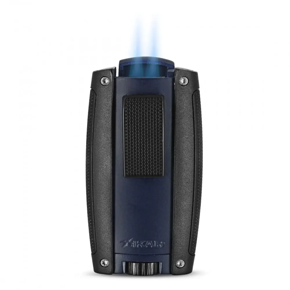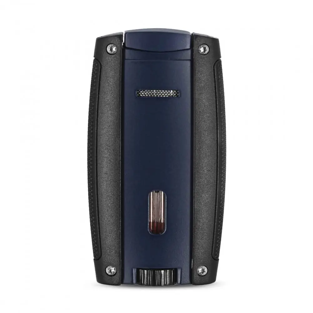 this turismo storm lighter combines style and practicality with its matte blue design and black sides. it features two wind-resistant intensity-adjustable torch flames and a gas level window.